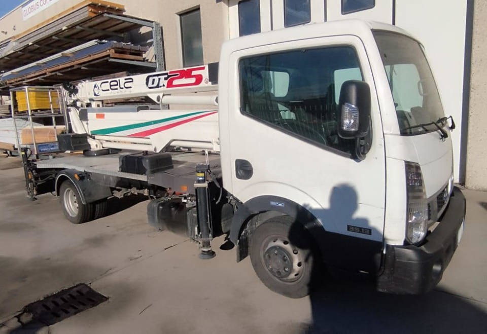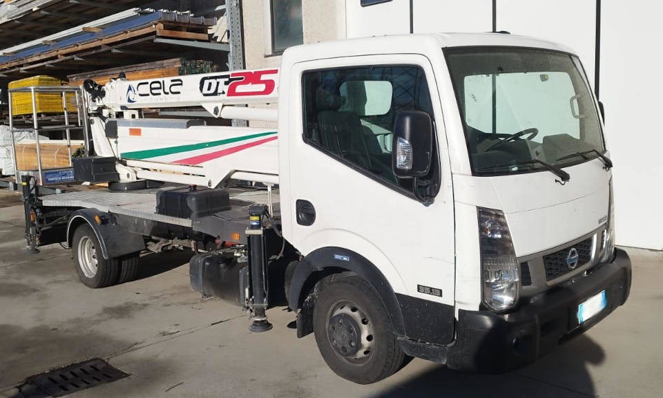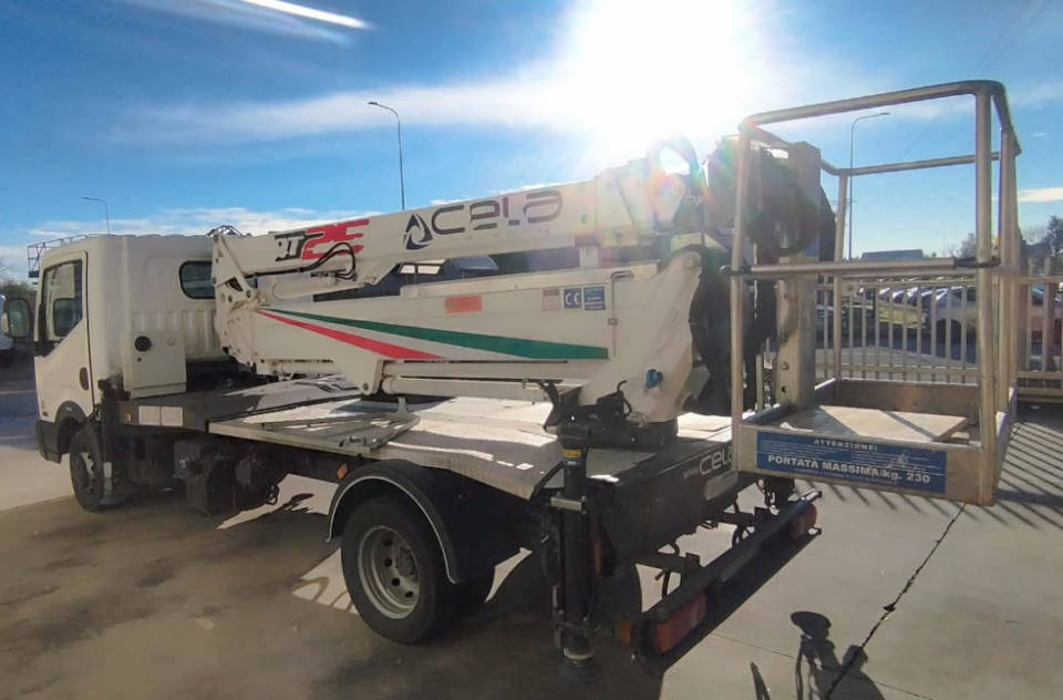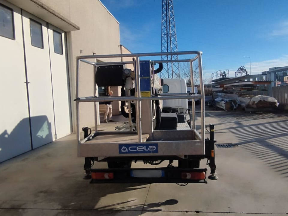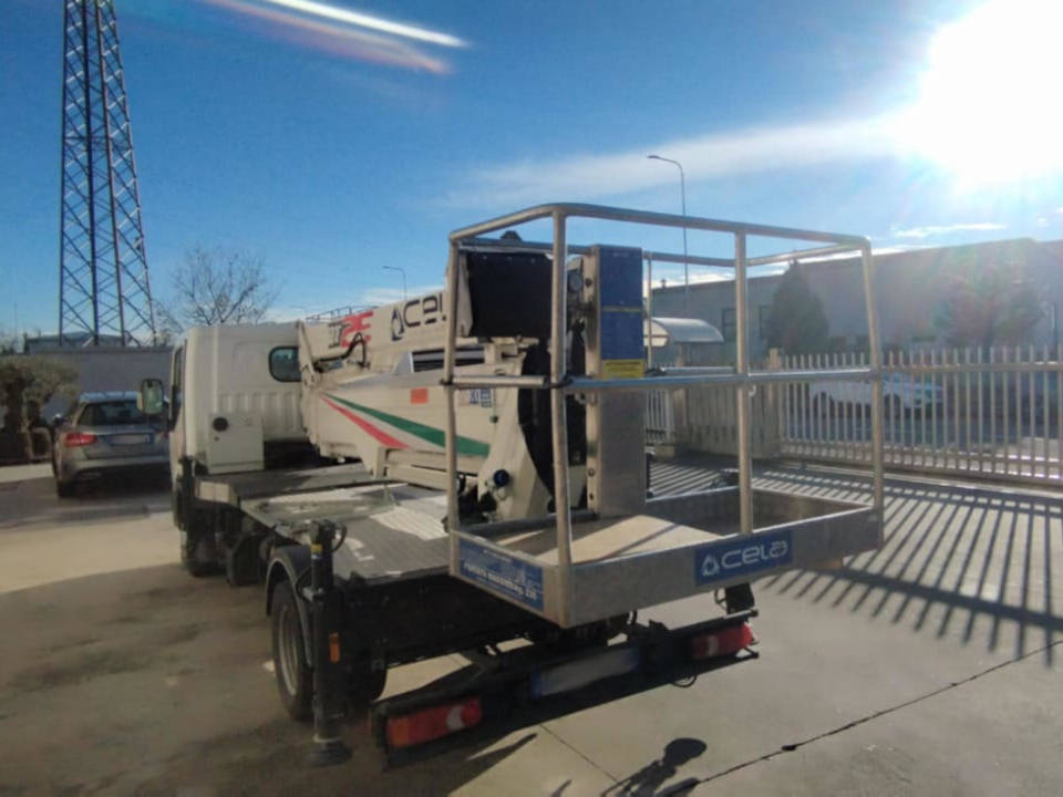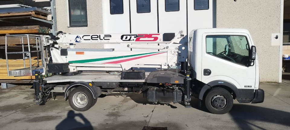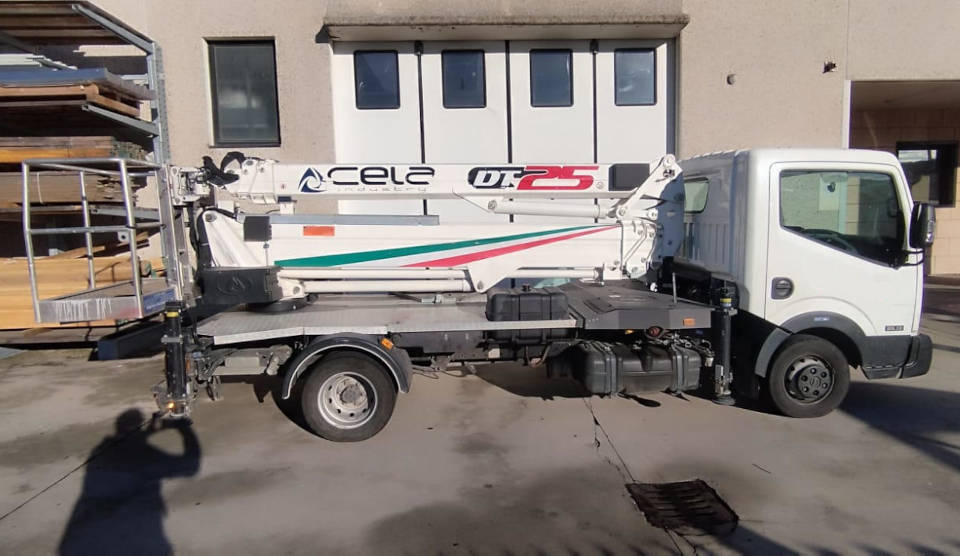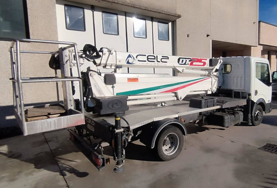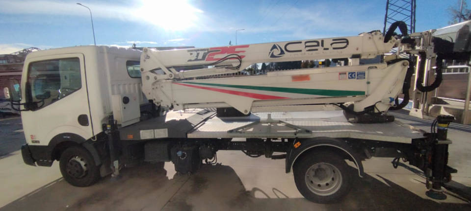 This Cela DT 25 aerial platform is a used platform from 2019. The Cela DT 25 platform is equipped with a 230 kg capacity personnel basket and a 260 kg lifting hook, ensuring simple and safe operations. The Cela DT 25 truck-mounted platform reaches a maximum working height of 25 meters and can also be used under bridges, with an outreach of up to 12 meters. This used platform has 4,300 actual working hours. It is in excellent overall condition.