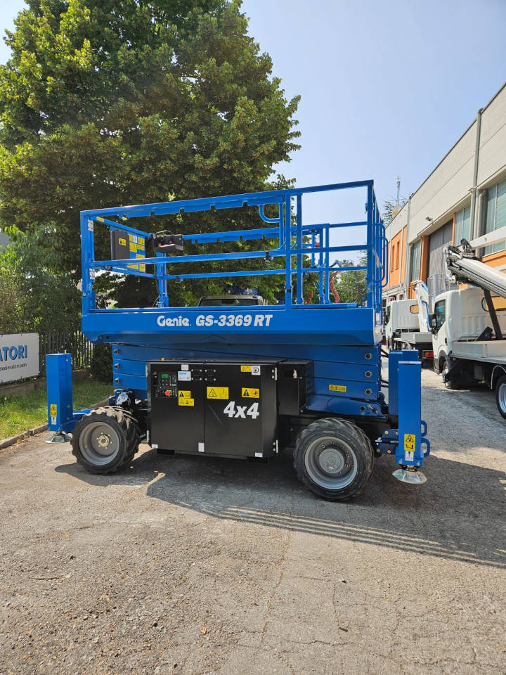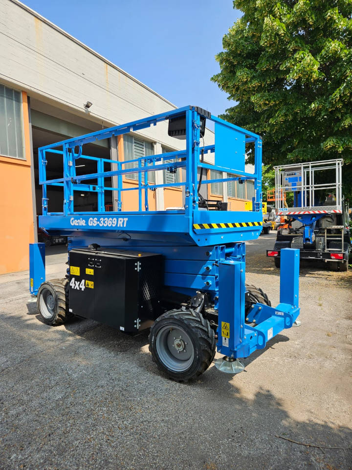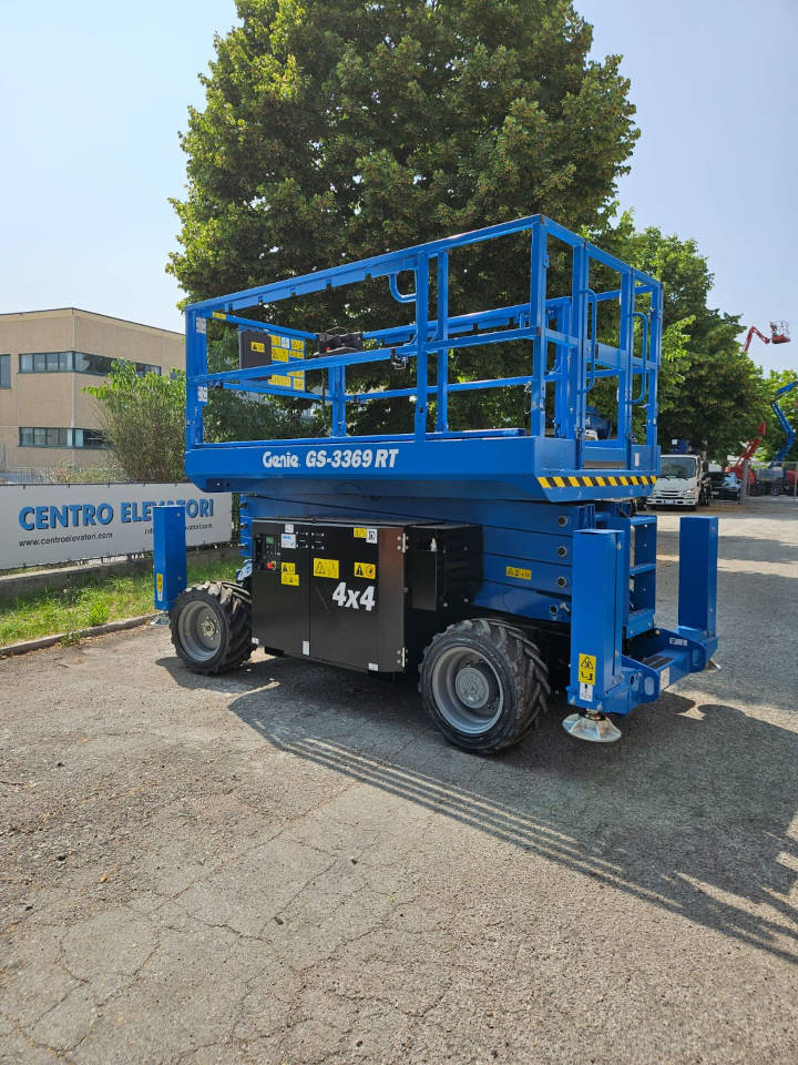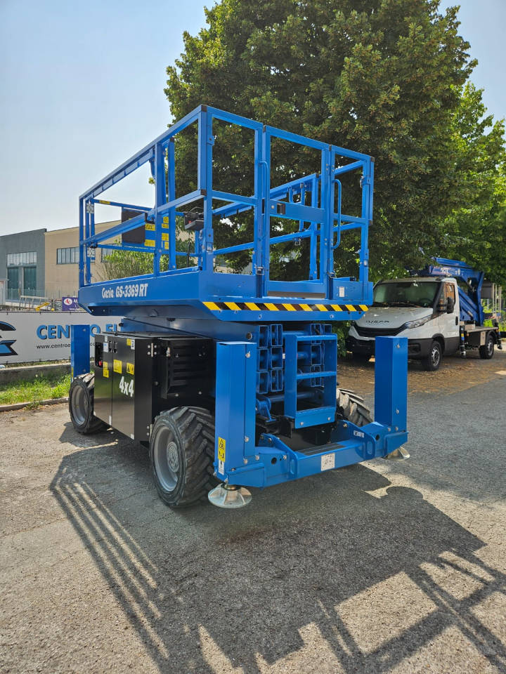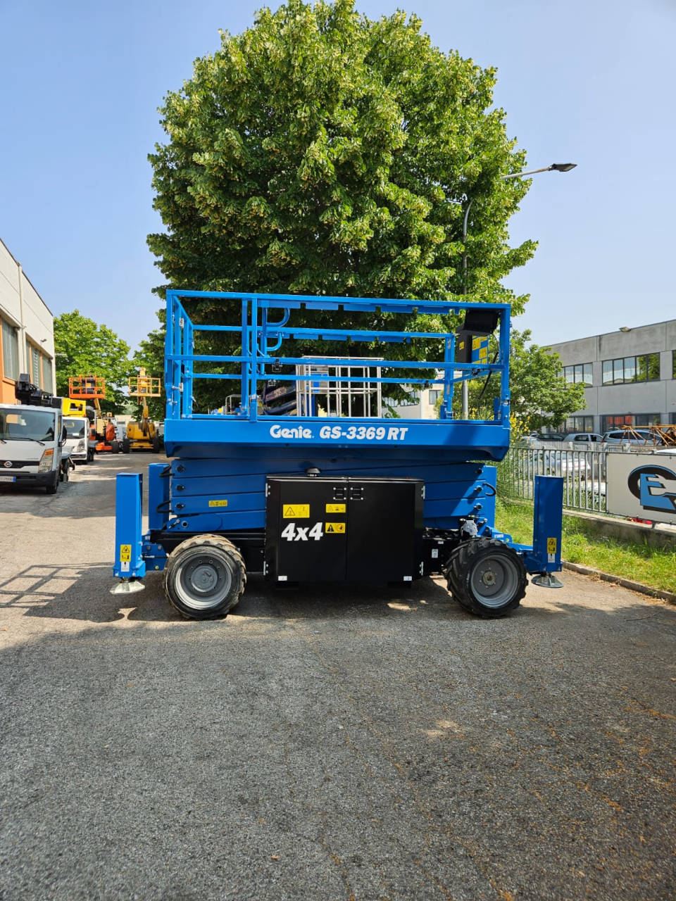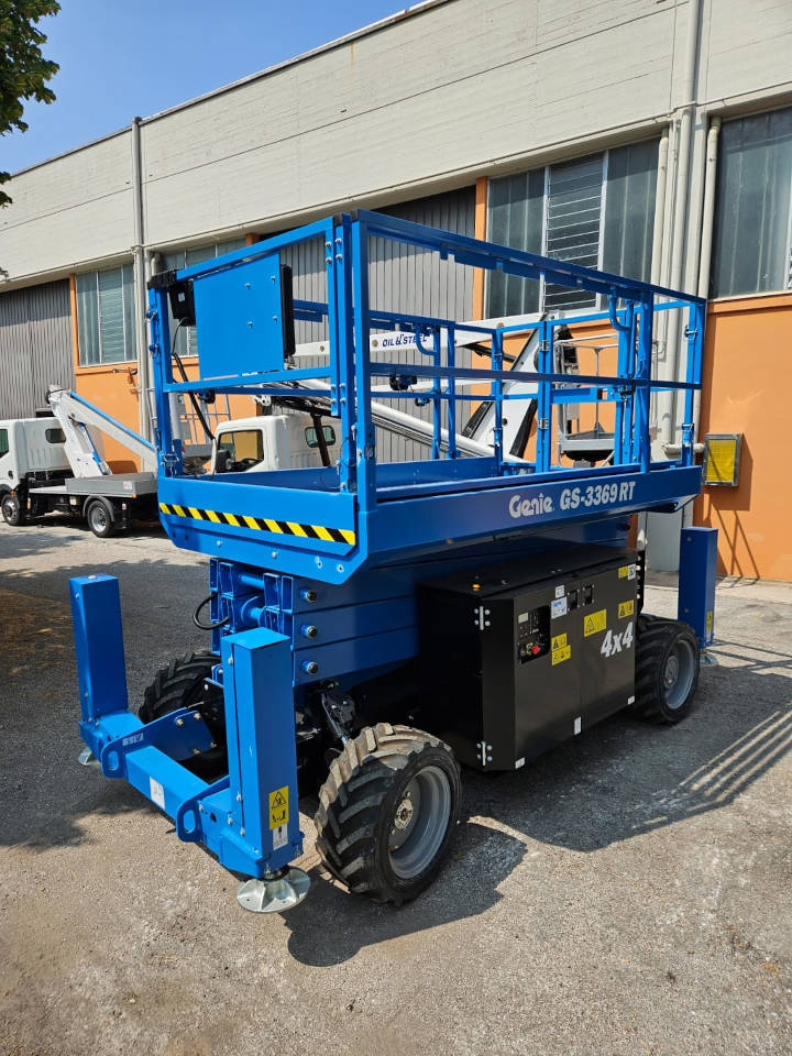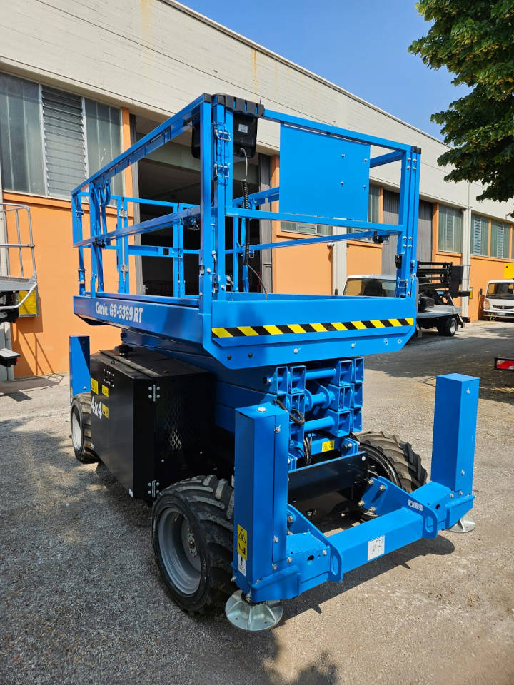 The GENIE GS-3369 RT Vertical Aerial Platform is a new platform. The GENIE GS-3369 RT platform has a man basket with a capacity of 454 kg. This vertical platform ensures easy and safe maneuvering. The vertical platform reaches a working height of 12 meters. The Genie GS 3369 RT rough terrain scissor lift is designed to offer excellent robust performance, with the ability to travel on difficult and uneven terrain. Equipped with 4 stabilizers it allows to work in difficult situations. Built to last, it is ideal for increasing operator productivity on demanding outdoor job sites. Working hours 0.
