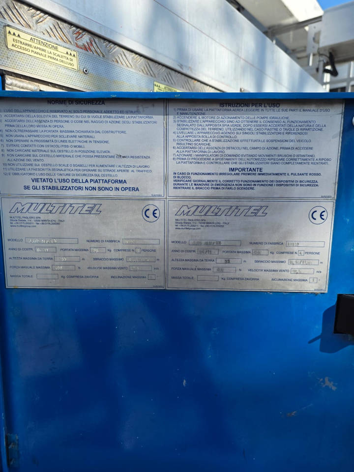 The Multitel J335 ALU EX platform is a used truck mounted platform of 2011. The platform Multitel is equipped with a man basket with 400 kg of capacity lifting, which ensures that operations are carried out easily and safely. This truck mounted platform reaches a maximum working height of 35 meters, with a horizontal outreach of 22 meters. The platform Multitel J335 ALU EX has 4100 hours of effective work. Excellent general conditions.