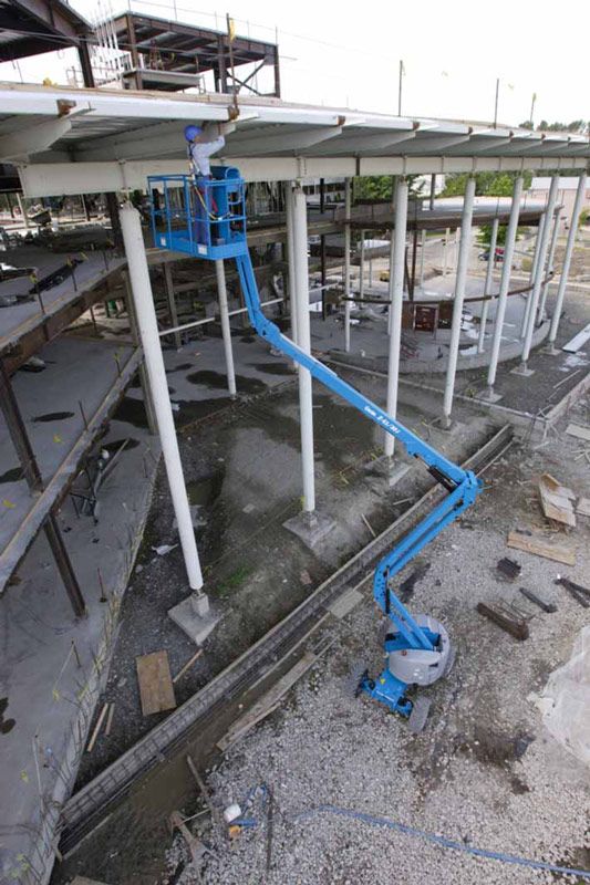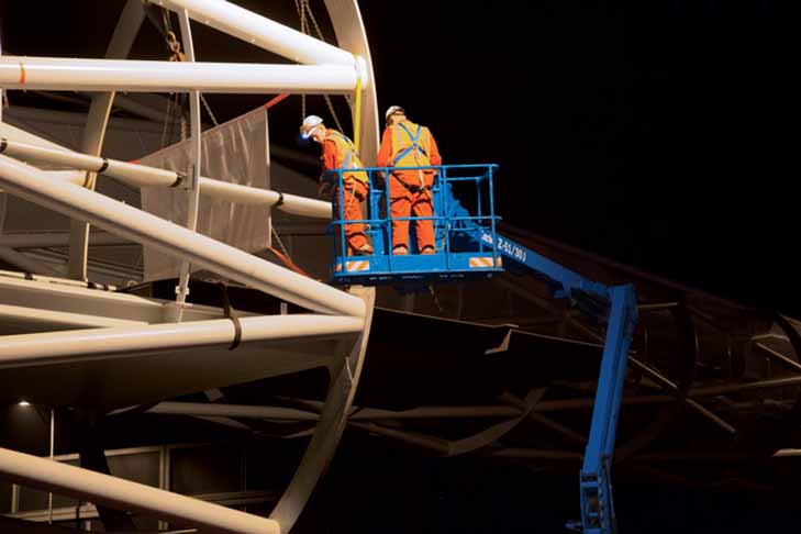 La rotazione idraulica della piattaforma di 160° con funzione autolivellante garantisce comfort e sicurezza per l’operatore, mentre il raggio di sterzata ridotto e l’ingombro di coda nullo permettono di lavorare agevolmente anche in spazi ristretti o cantieri congestionati.