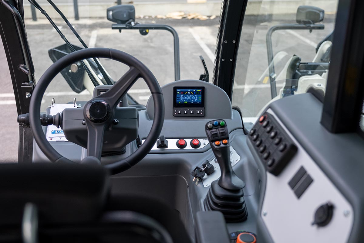 La cabina, tra le più spaziose della categoria, offre ergonomia avanzata, comandi intuitivi e monitor LED a colori ad alta leggibilità. I fari LED ad alta potenza permettono di lavorare anche in condizioni di scarsa illuminazione.